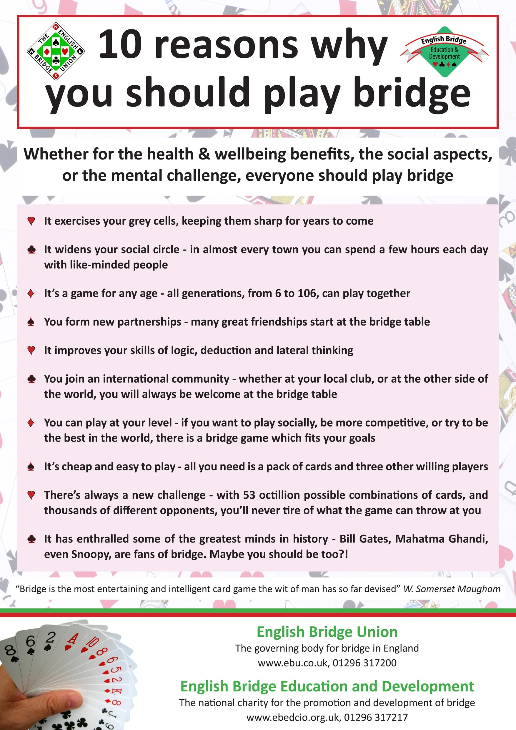 Improver holidays are focused on both learning and play, in a friendly and social atmosphere and at a relaxed pace. They are run by experienced and friendly teachers. They are not designed for complete beginners or experienced duplicate players. Rather, they are aimed at players who have been learning and playing fairly regularly for at least a year (preferably with some experience of playing in a competitive setting) and for players seeking to develop their skills and to gain confidence to play in competitive club duplicate sessions.