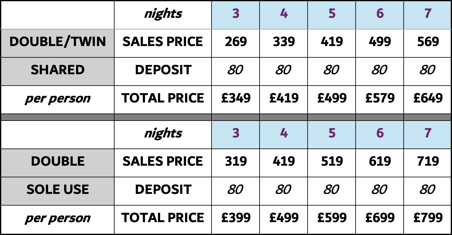 are subject to availability, please do not make any travel arrangements before booking your accommodation with us. Prices below are for main arrival dates only, please call 01656 747-700 for further assistance.