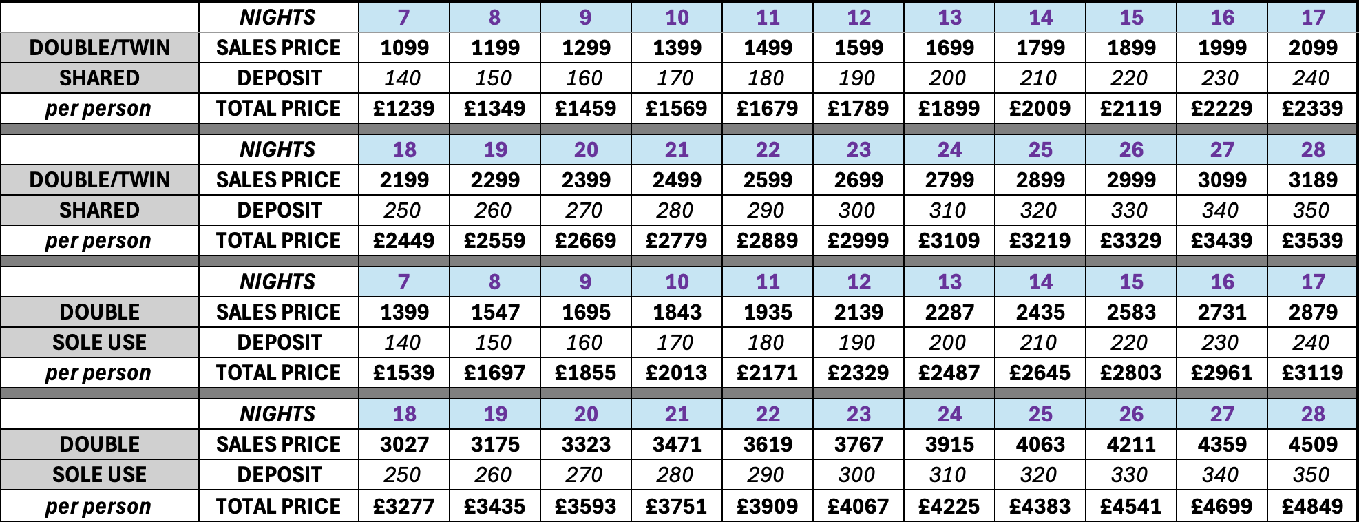 are subject to availability, please do not make any travel arrangements before booking your accommodation with us. Prices below are for main arrival dates only, please call 01656 747-700 for further assistance.